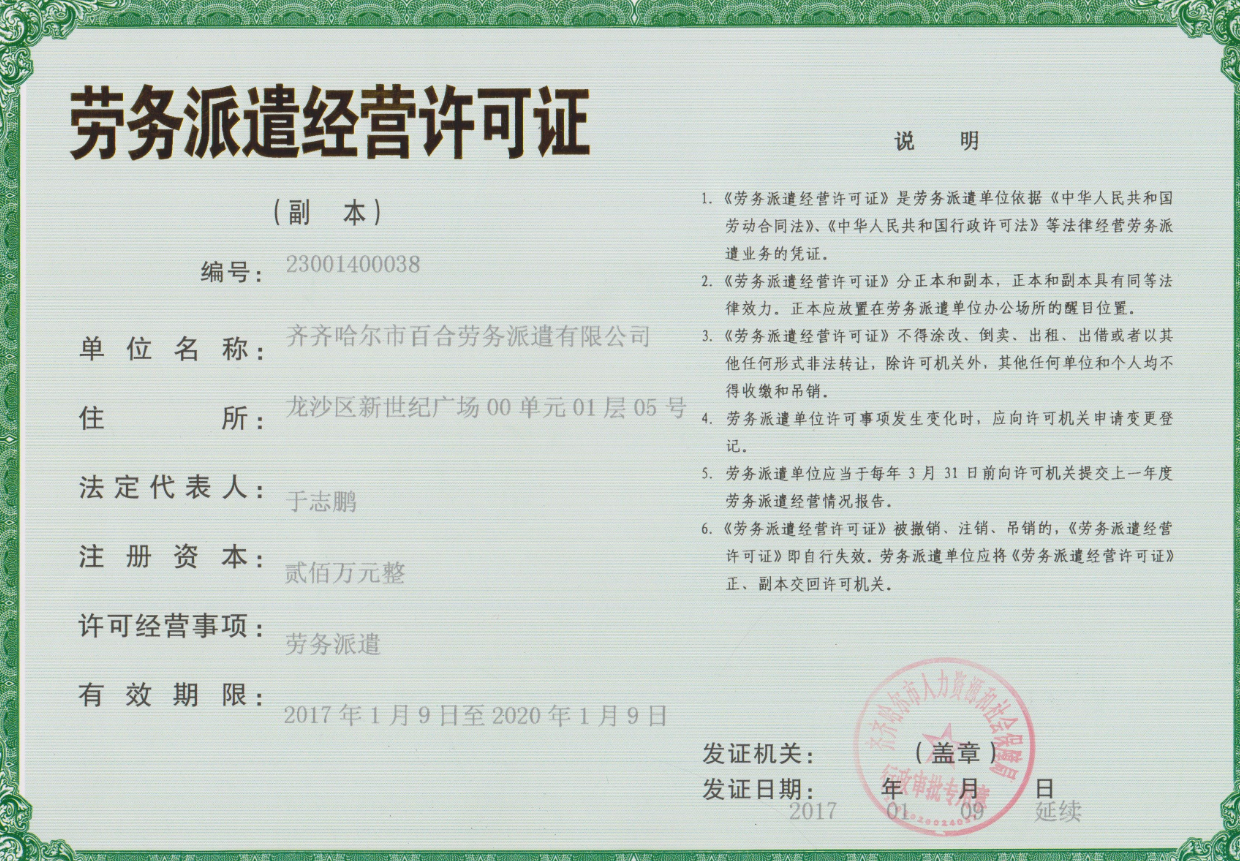 齊齊哈爾市百合勞務(wù)派遣公司成立于2010年5月,是經(jīng)齊齊哈爾市工商行政管理局核準(zhǔn);經(jīng)黑龍江省人力資源和社會(huì)保障廳批準(zhǔn)許可。注冊(cè)資金200萬(wàn)元。是專(zhuān)業(yè)的經(jīng)營(yíng)勞務(wù)派遣、勞務(wù)外包、保潔服務(wù)的服務(wù)公司。公司秉承為客戶(hù)提供規(guī)范、專(zhuān)業(yè)、******的人力資源增值服務(wù)理念,針對(duì)客戶(hù)“靈活、便捷用工和降低成本與風(fēng)險(xiǎn)”的價(jià)值需求,運(yùn)用先進(jìn)的管理理念、管理技術(shù)和規(guī)范、專(zhuān)業(yè)的服務(wù)能力,為大中型企事業(yè)單位提供勞務(wù)派遣、勞務(wù)外包、保潔服務(wù)和社會(huì)保障事務(wù)代理服務(wù)。公司建立了員工檔案管理、勞動(dòng)合同管理、工資發(fā)放、社會(huì)保險(xiǎn)繳納四大信息系統(tǒng),工作流程規(guī)范。對(duì)于每一家客戶(hù)單位,都有客戶(hù)服務(wù)專(zhuān)員負(fù)責(zé)聯(lián)絡(luò)、溝通和外派雇員管理支持,客服專(zhuān)員將嚴(yán)格按照公司的《客戶(hù)服務(wù)標(biāo)準(zhǔn)》和《勞務(wù)派遣協(xié)議》進(jìn)行事務(wù)的處理和服務(wù)的跟進(jìn)。